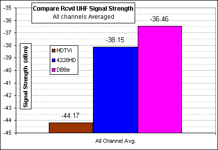 Another way of comparing gain of the antennas is to directly compare received signal levels to that of the HDTVi antenna. The HDTVi antenna was selected as a reference antenna mainly because it was thought that it’s gain would be relatively flat across the UHF band. Also it was thought that the SWR of the HDTVi would be relatively good (close to 1). Part of the reason for the above assumptions is that Log Periodic antennas can be designed to meet the criterion: flat gain and favorable SWR. The physical appearance of the HDTVI suggest as much.