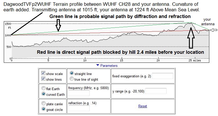 Thank you for the additional information by PM. This profile shows that the WUHF and other Rochester signals have a hard time getting to your antenna because of the hill that blocks a direct signal path.