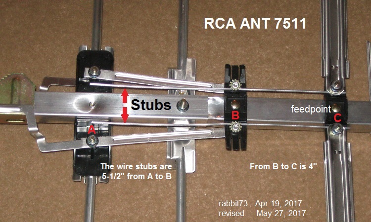 The shorting stubs must be attached an odd number of 1/4 waves away from the UHF feedpoint. If they were attached to the feedpoint, they would short out the UHF signals. In the RCA ANT 751, they are attached to the top of the Tetrapole, which is 3/4 wavelength before the feedpoint through the Tetrapole.