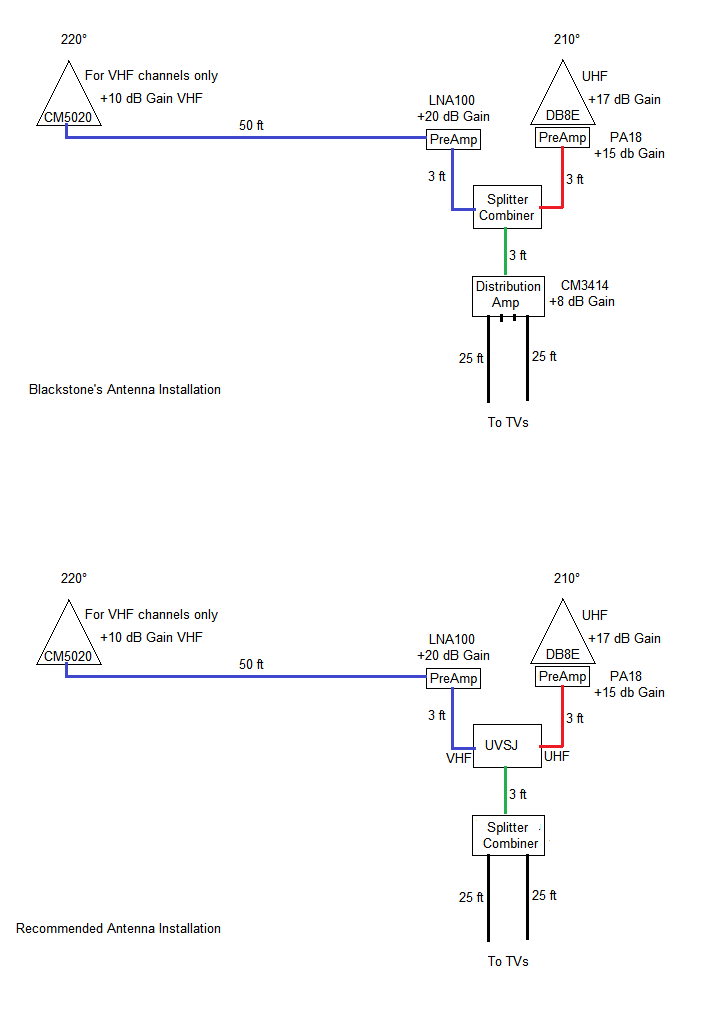 OK, great, thanks for answering all the questions. I think the best thing to do at this point is to obtain a UVSJ and rewire your system as I have shown on the bottom of the attached drawing. It will be real simple to do. You will be putting in the UVSJ where your combiner/splitter is currently located and replacing your distribution amp with the combiner/splitter (you can always put the distribution amp back in if you need to). You already have plenty of amplification with the preamps and the distribution amp might be overkill. I think the UVSJ has a good chance of resolving your problem.