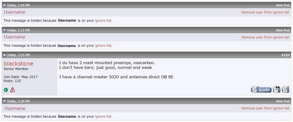 Everybody's tired of hearing about your set up. Everybody has a different need for different antennas and preamps. Just because your's works great for your situation doesn't mean everybody needs a Johanssen amp and 2 "Winegrud" 8200U's 2 91XGs on a 150 foot Tower.