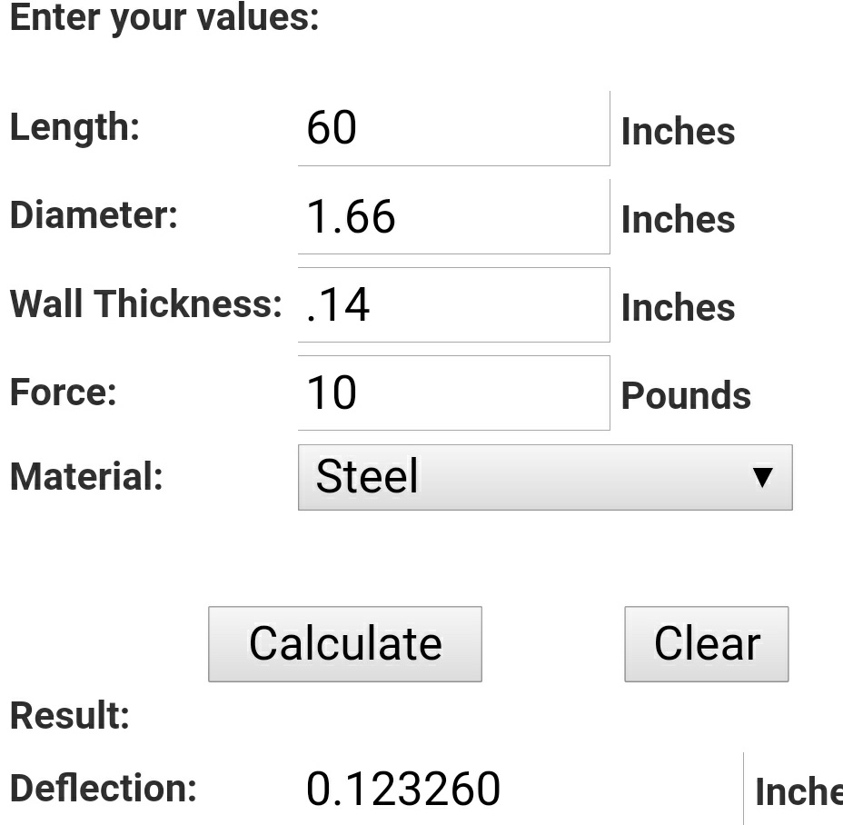 I was thinking of galvanized pipe available at my local Home Depot. They have 10' lengths of 1" and 1.25" which are much thicker than 18 gauge. They also have thicker and bigger fence posts. My calculations show that if I apply a 10 lbs load to the end of a 5 foot tube:
