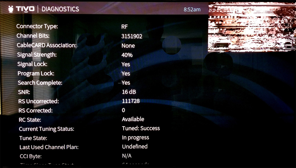 Signal levels, expressed as a %, vary from day-to-day, hour-to-hour, from a low of 37% to a high of 60% and better. Of course, SNR tracks that, predictably. Most days, most channels are virtually free of dropouts. There are 4 ATSC tuners in the TiVo. Even for quite low signals, the TiVo reports Signal Lock, Program Lock, and Search Complete to be "Yes."