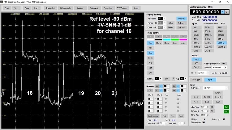The channel 16 signal input to the RSP1A with the 17 dB preamp measured -35 dBm. I don't usually use the preamp; just wanted to see how the RSP Spectrum Analyser software would handle the stronger signal.