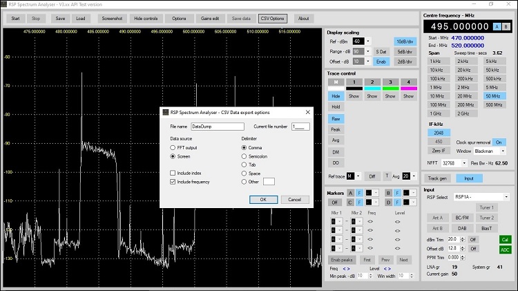 The only software that I know of that will produce CSV output is for the RF Explorer SA and the V1.1 RSP Spectrum Analyser for the SDRplay RSP1A: