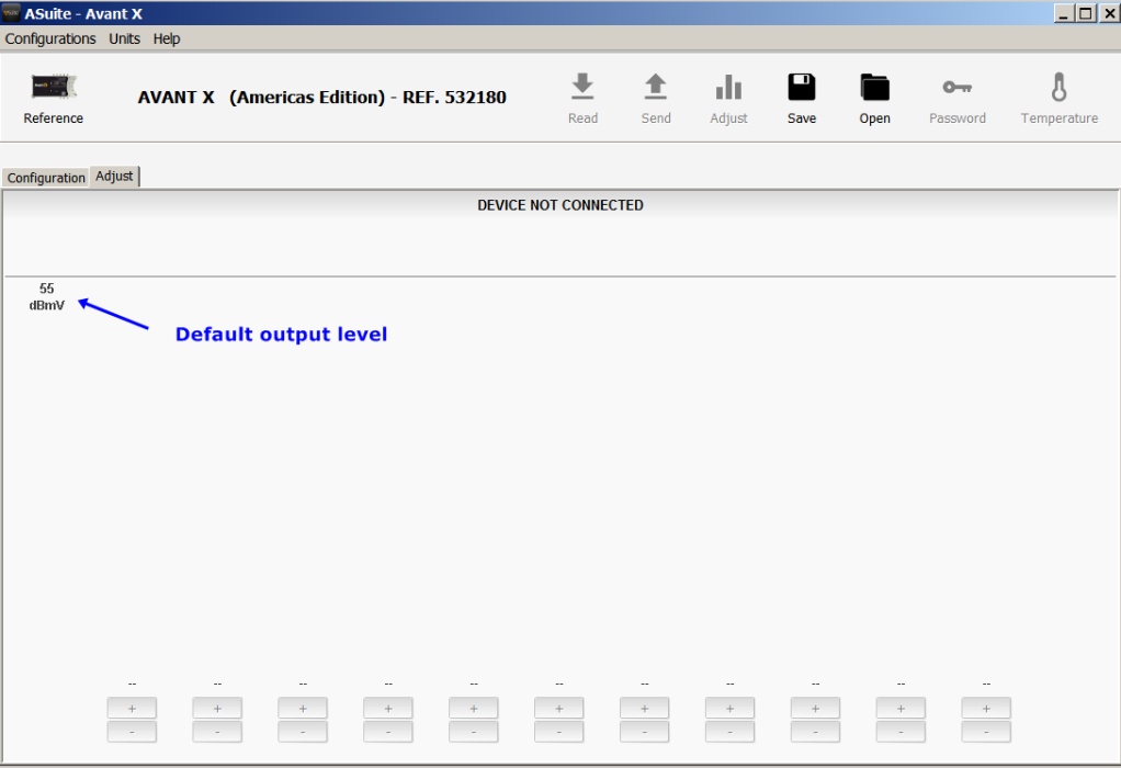 The output level in the Avant X is programmable between 30dBmV and 55dBmV, and also a slope setting is available for larger cable distributions, such an MDU for example. The higher values will likely be too strong in many residential settings, so the Avant also features a -20dB output, on which the programmed value will range between 10dBmV and 35dBmV. So in practice, the output level can be adjusted between 10dBmV and 55dBmV, enough range to cover a wide variety of distribution scenarios.