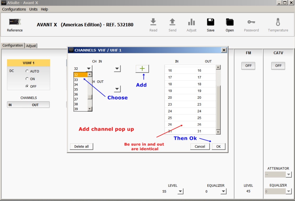 Another common configuration mistake is for users to program filters in empty channel locations "just in case" something comes in. This should not be done because the Avant X will maximize the gain of that filter during adjustment, only to add noise to the aggregated signal. The Avant X is intended to acquire existing signals from a set of antennas, and process, balance, and combine them in the best way possible on a compact headend solution. The Avant features an FM input that will be adjusted according to the output level programmed in the unit, and a CATV mix input for when it is used to inject OTA channels in an existing cable distribution.