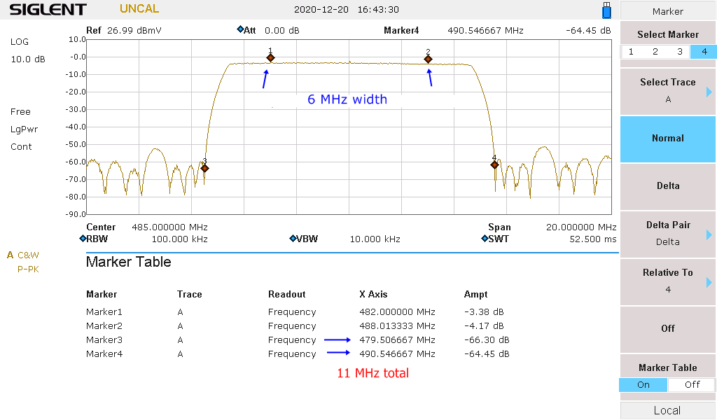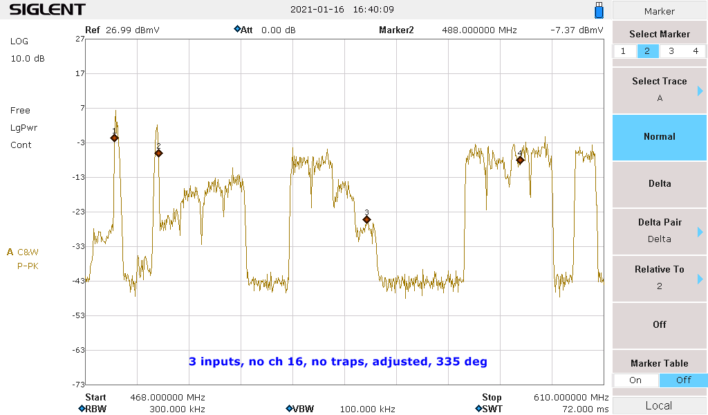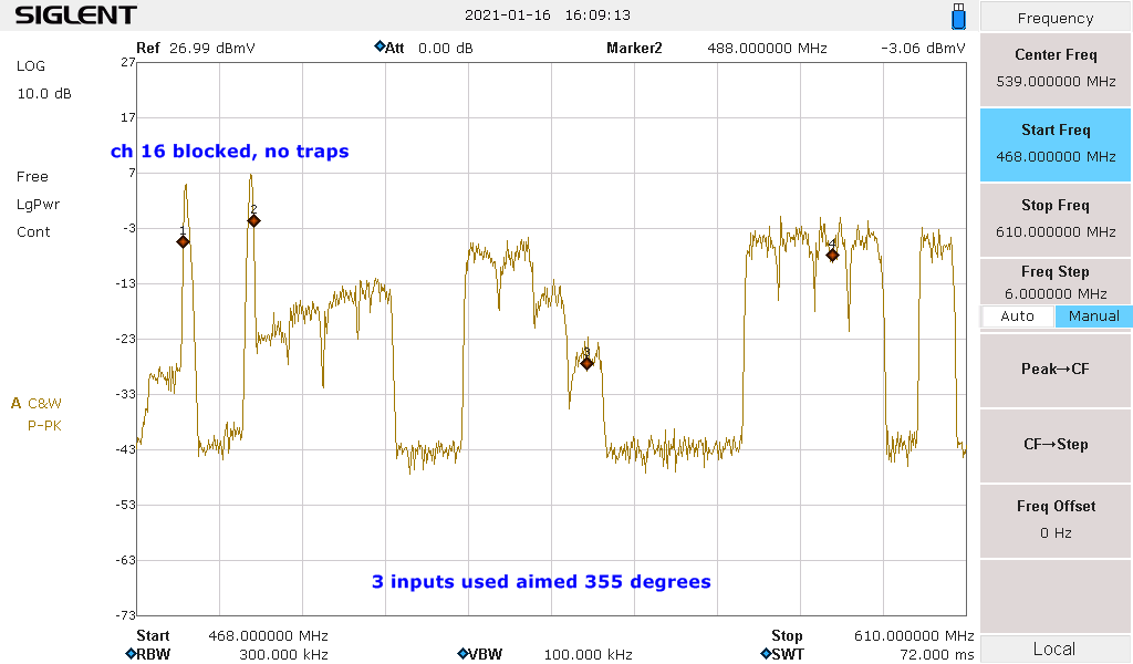 This gross signal difference (around 40db between adjacent channels off the antenna) is way too great for this to handle, even with the 20db reduction of that after my traps. Compounding that is the 'slop' left over of the offending adjacent channel from their filters too narrow filter 'shape factor'. (There is a 'wide' and 'narrow' shape factor that is based on if there are adjacent channels active or not)