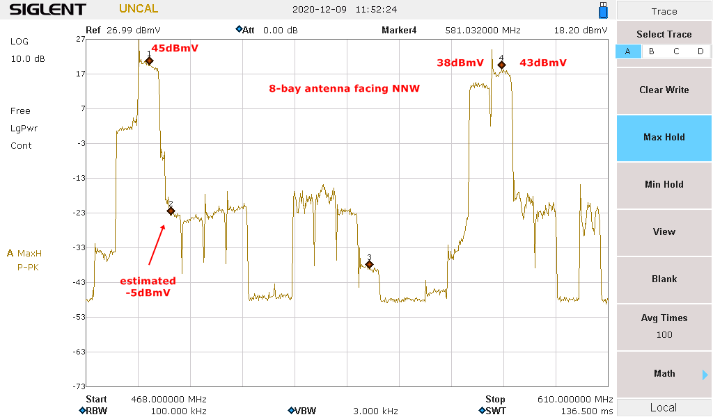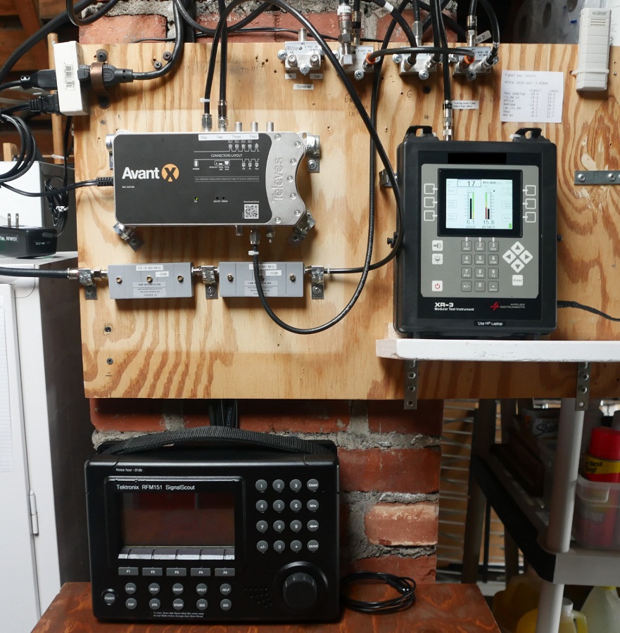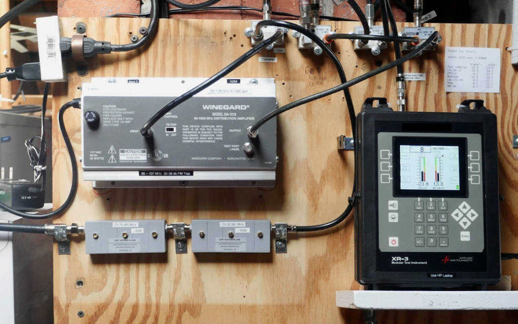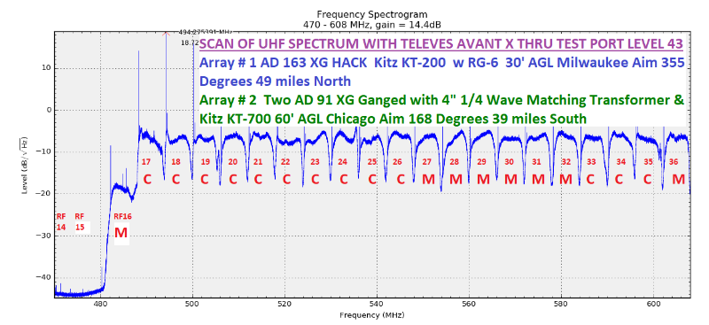Below are pics of the testing, then the final setup in the attic, (not a crawl space) and a scan of the 'traps' that allow to Winegard DA-1018 DA to work where the Avant-X didn't. (The double trace was the traps flipping the order to see if that mattered, the 'dips' are ch 15 & 16 then 31 & 32)