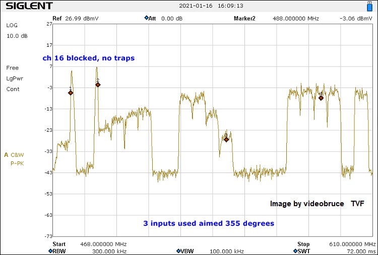 Therefore, the use of traps attenuates effectively the higher level channels, yet impairs the adjacent ones. In the scenario we have, the trap in channels 31 and 32 would be useful, impairing channel 30, whilst the use of traps in channel 15 and 16 impairs channel 14 and 17 from Toronto. There is a channel 33 in use, yet received by the second antenna pointing to SW. Therefore it would not be affected by the use of the trap 31-32, provided that this second antenna uses a different input of the AVANTx to process the channels.