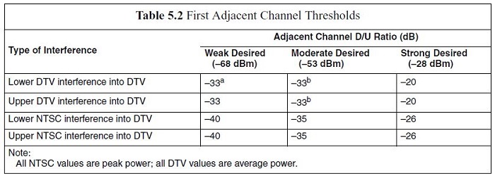 The receiver should meet or exceed the thresholds given in Table 5.2 for rejection of first adjacent-channel interference at the desired signal levels shown above the columns therein.