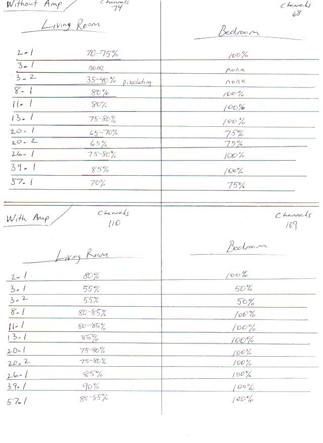 I finally set up my ant751r and rca preamp (tvpramp1r) this weekend. The antenna was mounted high up (25 ft) on my hardi plank chimney aimed at 169 degrees magnetic. I made a spreadsheet showing the reception percentages. Hopefully this data will help others in similar reception areas. I was picking up channel 3.1 and 3.2 from bryan/college station even though the antenna was facing nearly the opposite direction, towards sw Houston. Note the tv in my bedroom only displays in 25% increments. I am happy with the results and plan to cancel dishnetwork in about a month. I plan on buying another roku 3 and networking them both to a tablo dvr. Anyway, here are my results: