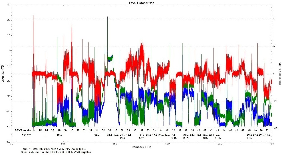 As I already mentioned, cable loss in coaxial cable increases with both frequency and run length. Channel 14 starts @ 470 MHz and the high frequency edge of channel 51 is at 698 MHz. To give you a feel for the difference in performance I compared the losses between mounting the amp very near the antenna using a 3’ section and further down using a 12’ length. I also thru in a 38’ length of coax with 3 dB loss @ 698 MHz because most people are familiar with 3 dB doubling the signal and -3 dB halving the signal.