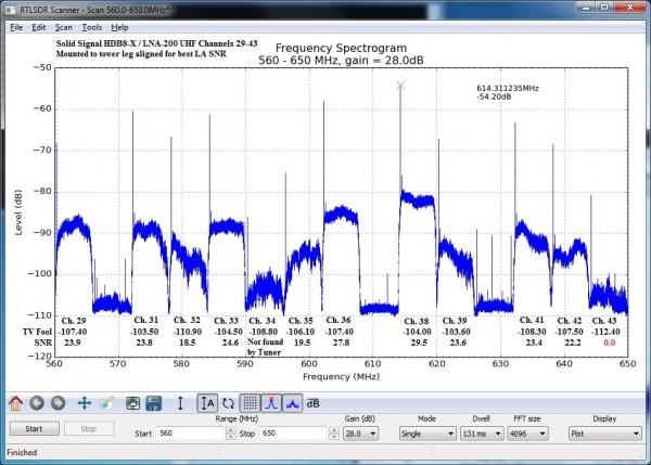 I found a good symbol quality (nearly 100%),and signal level by pointing the VHF antenna off the 160 degree direction for channel 9, but it was very sensitive to the exact position & orientation of the antenna. This direction was towards a low hill several miles distant. I was prepared to leave well enough alone, but suddenly and inexplicably lost the signal and could not get it back. Still a mystery.