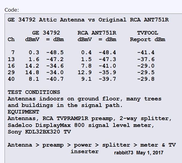 Wow, rabbit73.....you're THE MAN! Excellent testing especially given indoors and limits of your current situation from what you used to be able to door with your outdoor set up. And unfortunately, the updated RCA 7511 doesn't appear to compete with the newer indoor GE Attic; as compared to it's very successful former RCA 751. My advise would be to grab a long box 751 if you can find one while you still can! Thanks a million, rabbit73! We're fortunate to have your expertise and input on TV Fool!!