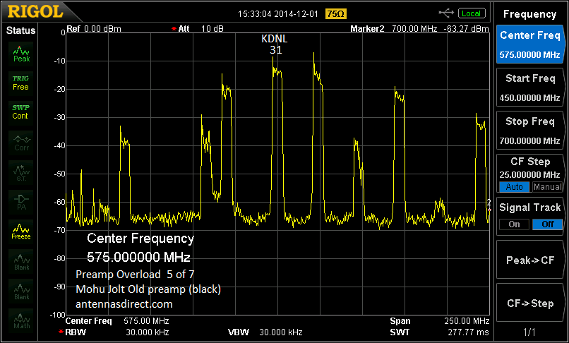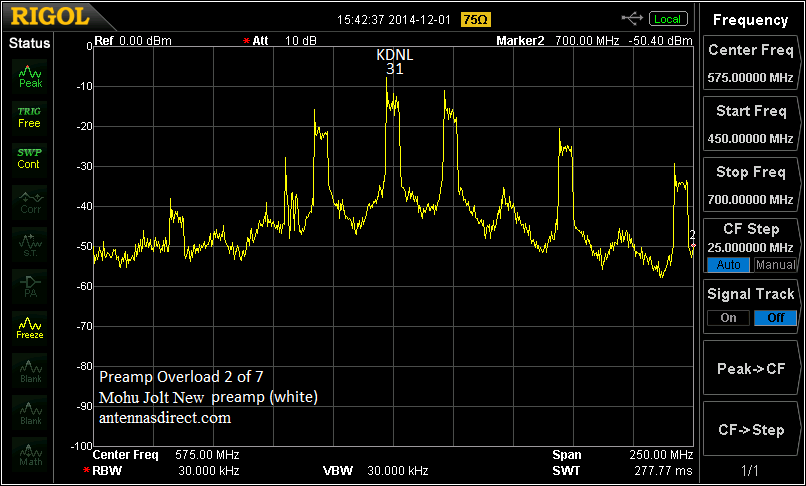 This is what the same signals look like when the preamp is moderately overloaded. Notice that the weakest signals are damaged first. The noise floor rises from the spurious signals created by the IMD. This reduces the SNR of the weak signals to less than the required 15 dB minimum: