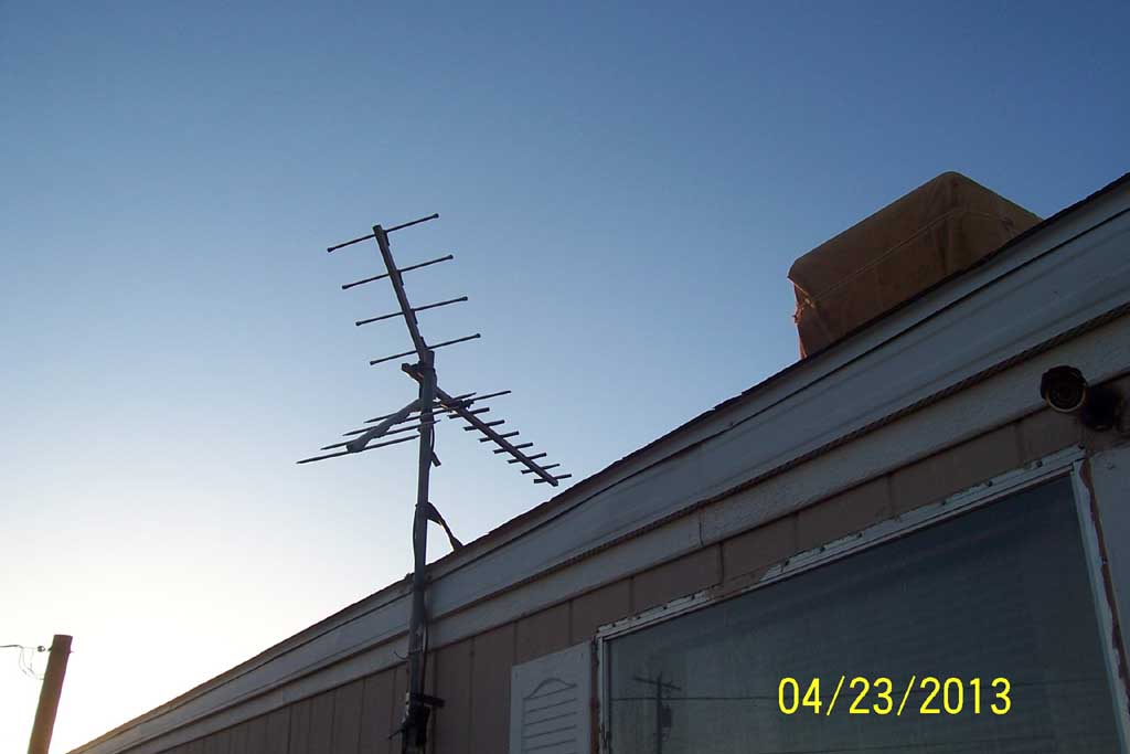 In the drawing, the back of the antenna is on the left, attached to a mast. The end closest to the transmitter is on the right side of the drawing.