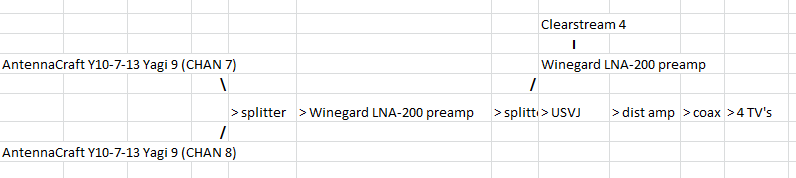 CH 7 yagi         UVSJ > LNA-200 > Power Inserter > dist amp > coax > 4 TVs