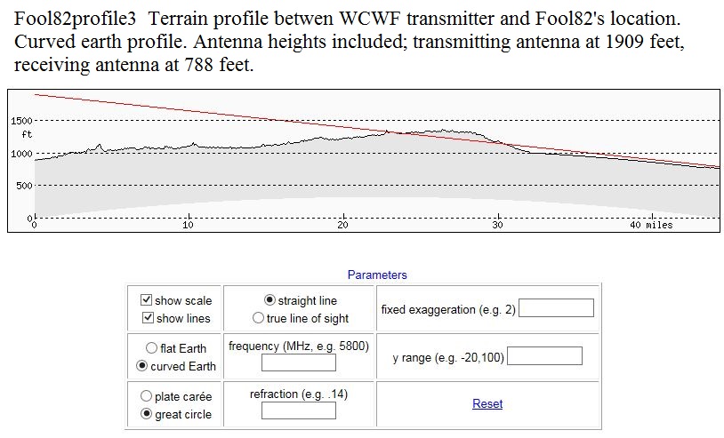 It's possible leaves from trees are blocking the signal from WCWF at this time of year. But normally I should at least see something from the televisions or either HDHomerun tuner at night. Currently there just isn't any signal to tune into at night. I hadn't payed close attention to the signal quality until earlier in August this summer. But I never experienced this last year of no signal over weak signal from last year.