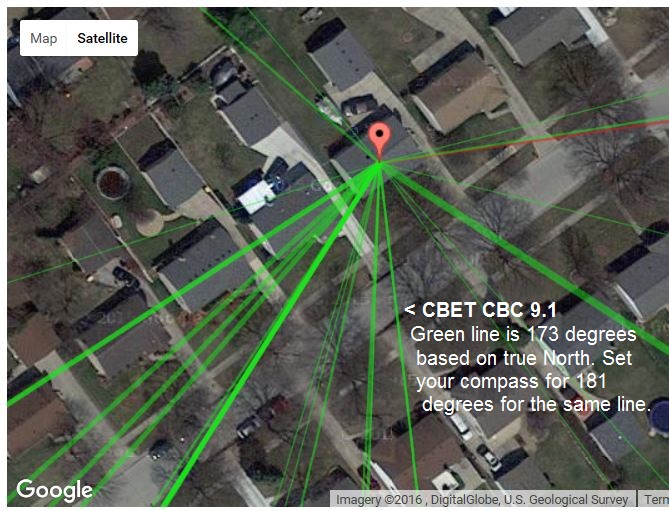 I picked a house in your area as an example. If it happens to be your house, it is a coincidence. You can use the green line and a landmark for aim. You can do your own green lines here by moving the cursor to the antenna location: